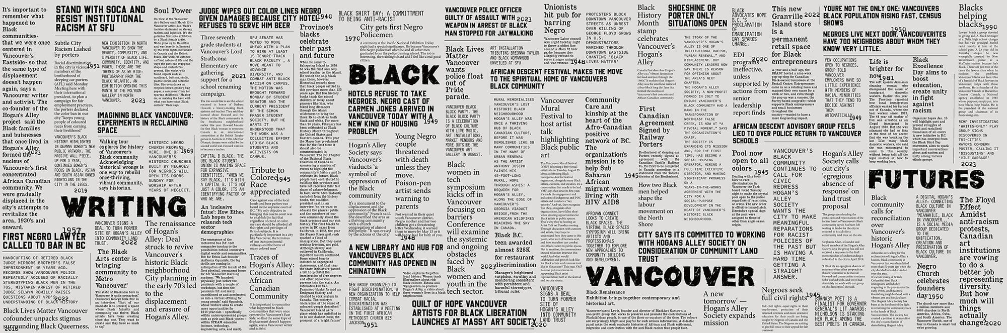 In its second iteration (first presented at The Museum of Anthropology in 2021-2022 as Writing Black Vancouver), A History in Perpetual Motion forges a visual timeline of call and response for Black Vancouver presence. Lewis's text-based installation threads headlines from archival and contemporary newspapers Vancouver Herald, Georgia Straight, Vancouver Sun, The Tyee, North Shore News, and The Province. Transcribing over 100 clippings from 1940 to 2023, A History in Perpetual Motion is an embodied offering, readdressing the labour of placemaking, anti-colonial work, cultural production, and collective conceiving of Black communities in B.C. In bold, the phrases, ‘a call to action’, ‘a declaration of being’, and ‘a hope for what's to come’. "Writing Black Vancouver Futures" and "Honoring Black Vancouver Histories"